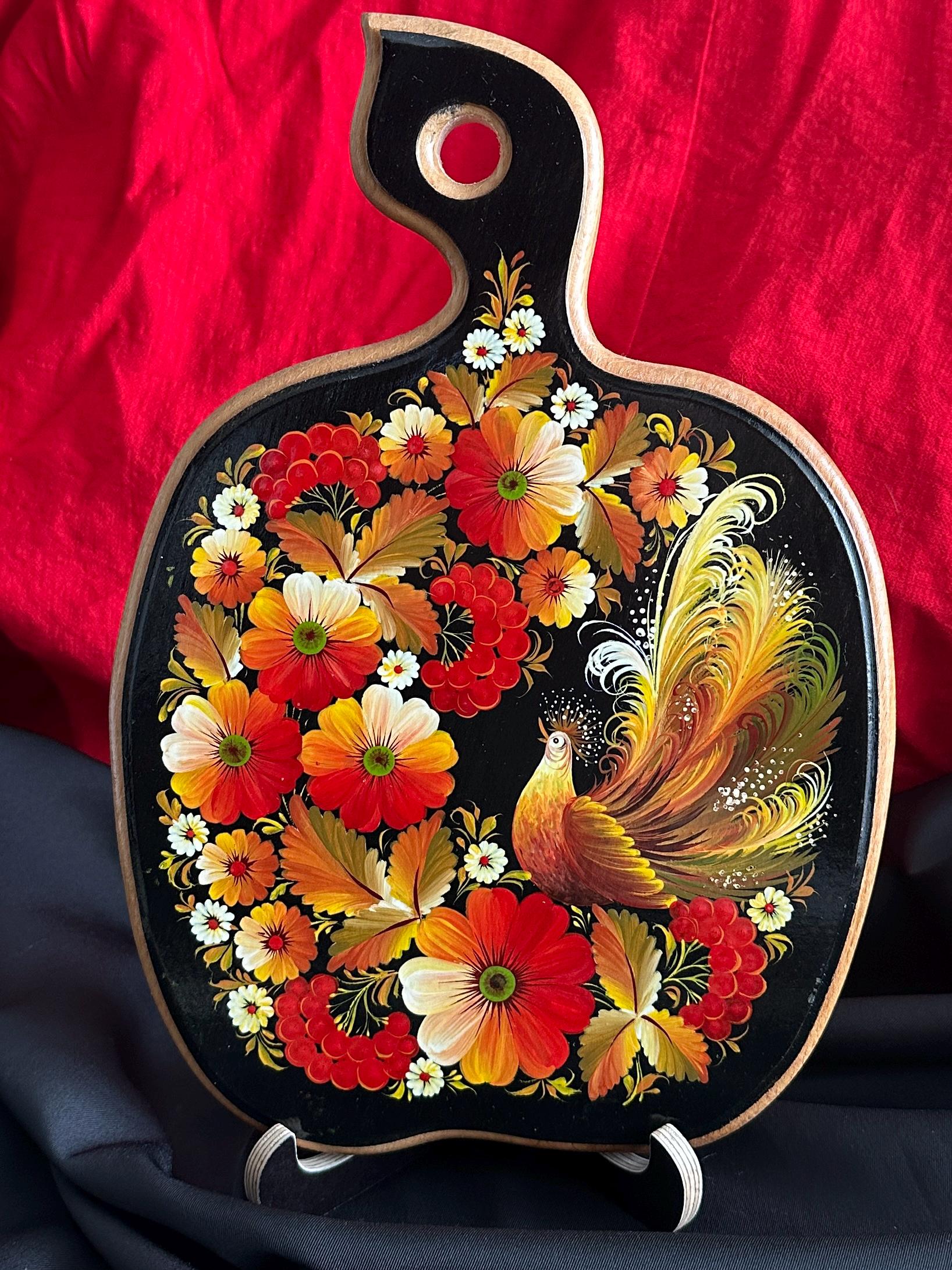 Cutting board with Petrykivka painting. The reverse side is working. Author's painting by master Fedorenko L. Material: wood. Size: 250x190 mm (9.84x7.50 in); Weight: 379 g.